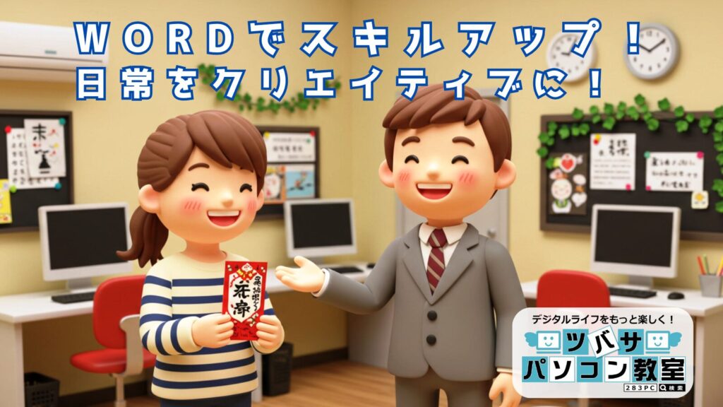 ワープロソフト「Word」を使って、はがき・案内文・チラシ・表・地図・ポスター・カレンダー・名刺など、さまざまな印刷物を作成するスキルが身につきます。